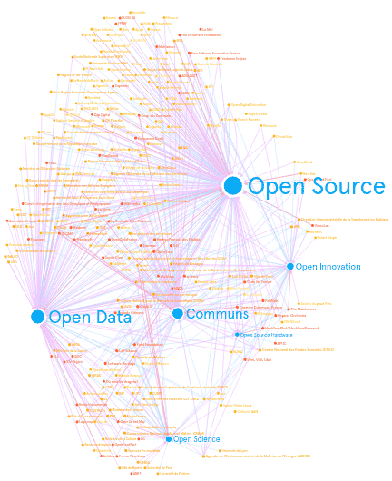 À cette occasion et afin de représenter la diversité des acteurs reliés par les valeurs fondamentales chères à inno³ — le libre et l’open source, les communs, et la science ouverte —, Maya et Romain, épaulés par toute l’équipe, ont créé deux visualisations de données.