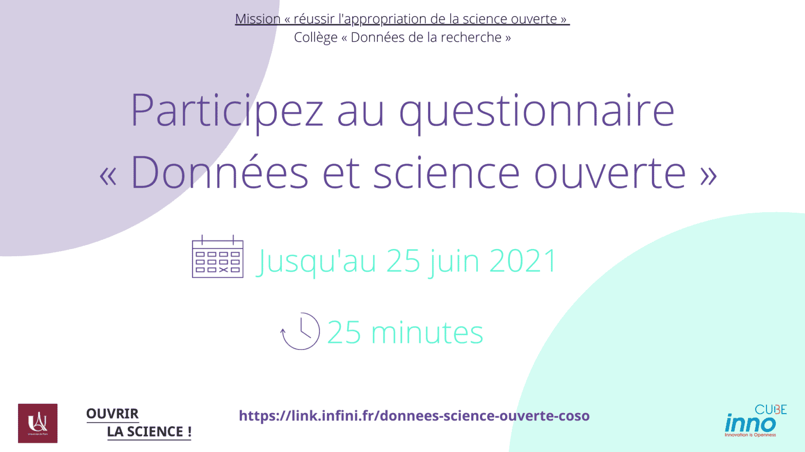 Dans le cadre de la mission « réussir l’appropriation de la science ouverte » que nous menons pour le Comité pour la Science Ouverte et l’Université de Paris, nous vous proposons de participer à un questionnaire dont l’objectif est de mieux comprendre :