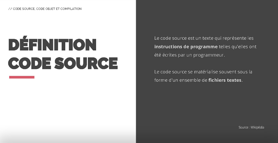 Afin de comprendre les subtilités de l’Open Source, il est nécessaire de maîtriser plusieurs notions liées au fonctionnement d’un logiciel. En effet, l’Open Source porte sur le code source, suite d’instruction de programme écrites par un développeur dans un langage compréhensible par les humains. Ce code source est ensuite compilé, c’est à dire traduit en code binaire, ou code objet, compréhensible par la machine sur laquelle on souhaite déployer le logiciel.