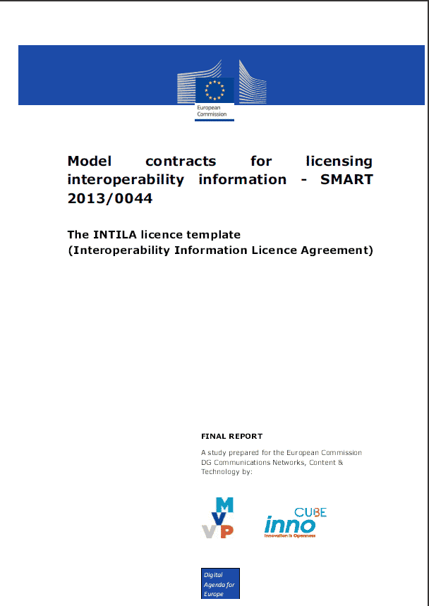 Rédigé à la demande de la Commission Européenne dans le cadre de l’Agenda Numérique européen, INTILA est un modèle de licence adaptable et configurable qui est proposé comme canevas pour concéder sous licences des Informations d’Interopérabilité (ce qui comprend APIs, formats et protocoles). L’objectif d’INTILA est de permettre aux entreprises de définir un cadre clair, non ambigu et juridiquement solide, favorisant le développement de produits interopérables avec leurs technologies. Technologiquement neutres, ces modèles sont adaptables à la stratégie et aux objectifs (légaux, commerciaux, politiques, techniques) de chaque acteur grâce à un jeu de clauses suggérées.