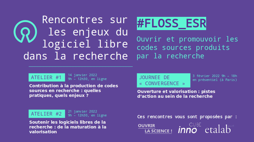 Le groupe de travail Logiciels libres du comité pour la science ouverte et le pôle logiciels libres d’Etalab vous convient à une série de trois rencontres en janvier et février 2022 sur les enjeux d’ouverture et de valorisation des codes sources de la recherche.