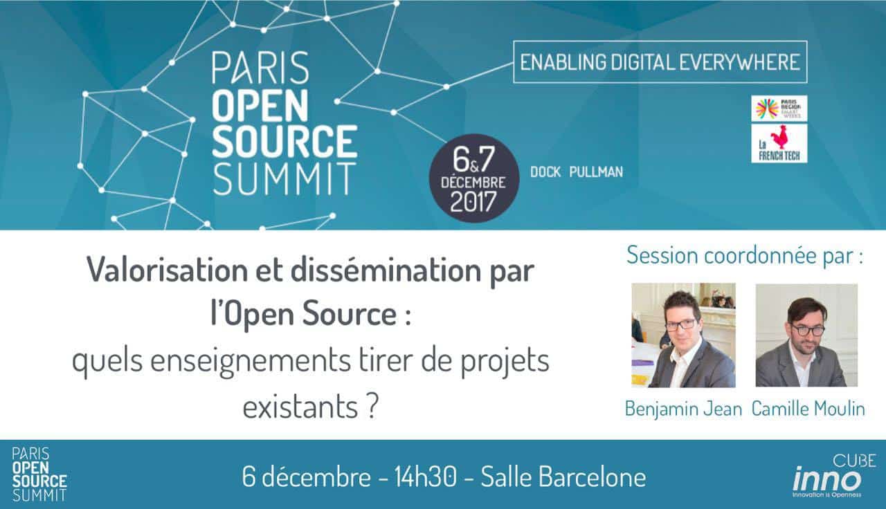 A l’occasion du Paris Open Source Summit 2017, Benjamin Jean et Camille Moulin animeront une session dédiée à la valorisation et la dissémination par l’Open Source, dont l’objectif est de partager et mutualiser des enseignements de projets existants, le 6 décembre 2017 de 14h30 à 15h30.