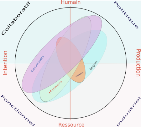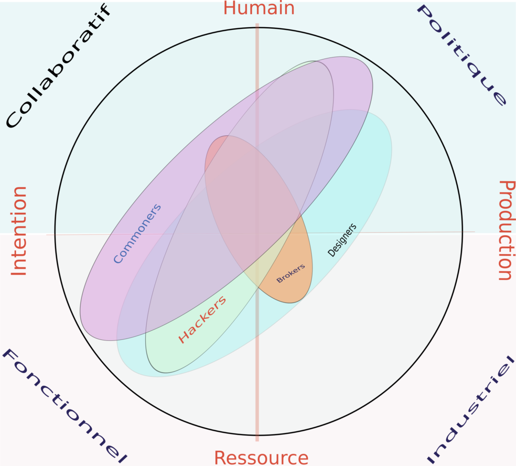 Tout au long de l’étude, les rôles des différentes personnes au sein d’une communauté ont été interrogées tout autant que leurs manières d’interagir ensemble. La figure du designer a été resituée par rapport à d’autres profils tels que les commoners, les hackers, les brokers (courtiers ou passeurs) afin de situer leur rôle respectif dans les communautés (cf. schéma ci-dessous).