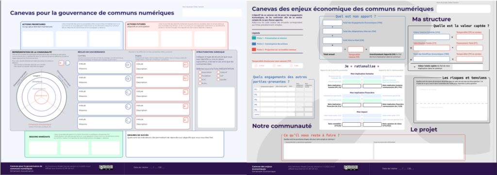 - Un « « canevas pour la gouvernance de communs numériques » » permettant de synthétiser les règles de gouvernance, la structure et la représentation de la communauté du projet, articulé par des actions et indicateurs.