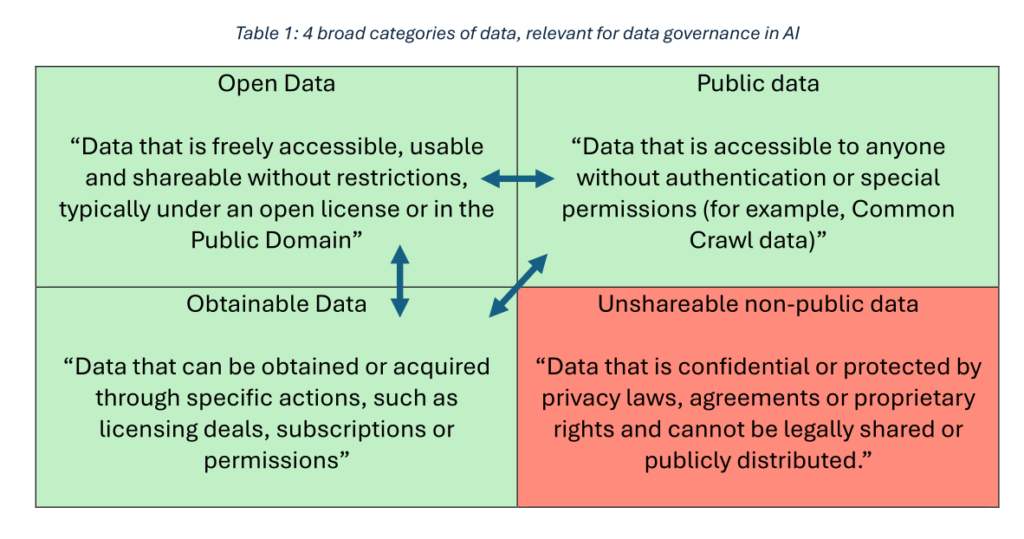 Le fonctionnement des IA, notamment les IA génératives et les modèles de LLM (Large Language Model), reposent avant tout sur des données d’entrainement présentes sur le web ouvert (open web dans le rapport). Elles peuvent être de différentes natures : données ouvertes accessibles sous une licence ouverte ou dans le domaine public, données publiques et données disponibles sous certaines conditions.