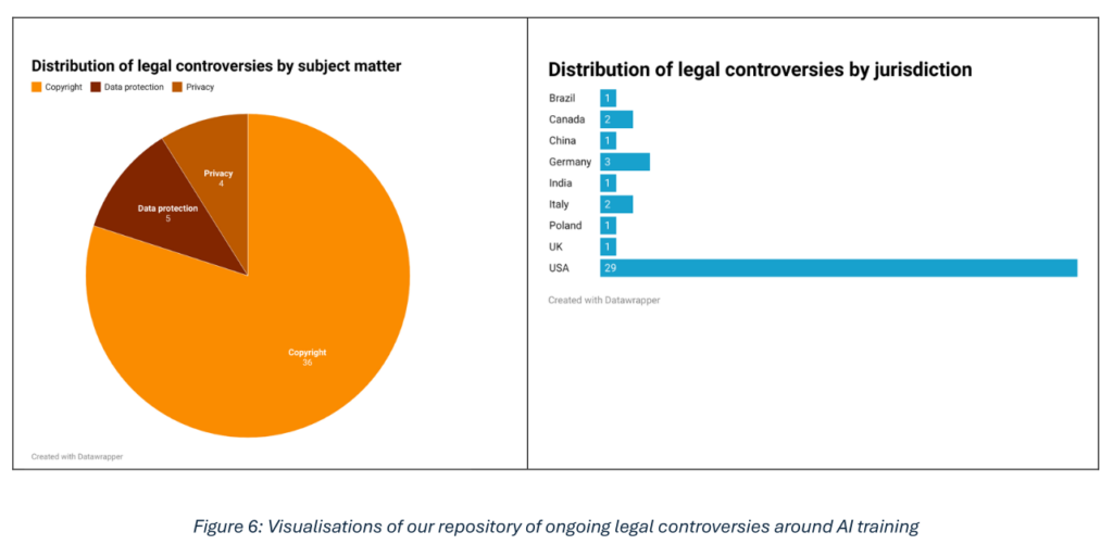 - Une liste de 41 controverses juridiques, en cours concernant les droits d’auteurs et la protection des données d’entrainement des modèles d’IA,