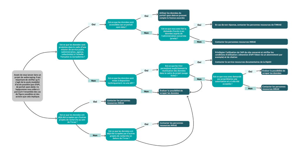 - Logigramme « Accès aux données » pour identifier où trouver les données avant d’utiliser la méthodologie de webscraping (ex. jeu de données en libre accès, API déjà existante),