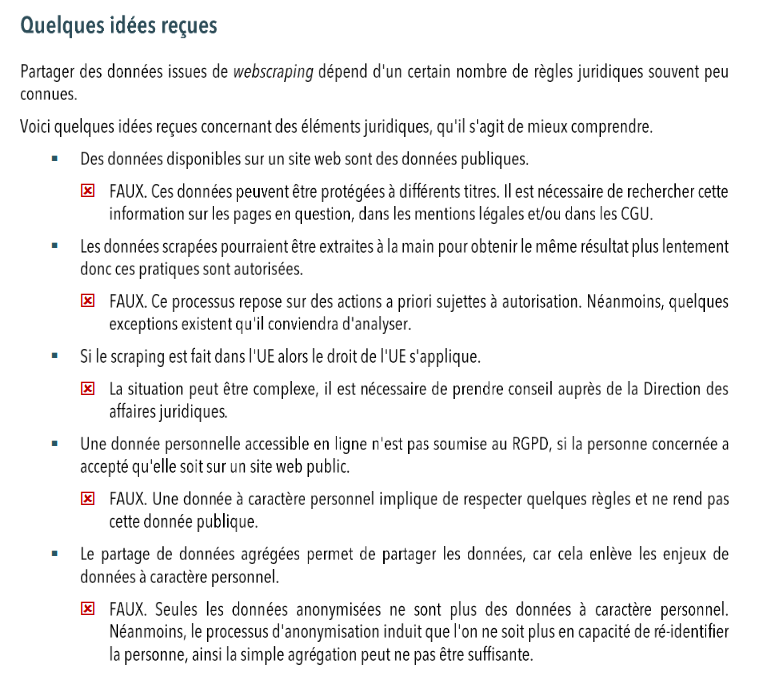 - un manque de connaissance juridique (ex. est-ce que j’ai le droit de scraper un site web, dois-je le prévenir un amont, quid de la législation européenne ou encore internationale, etc.),
