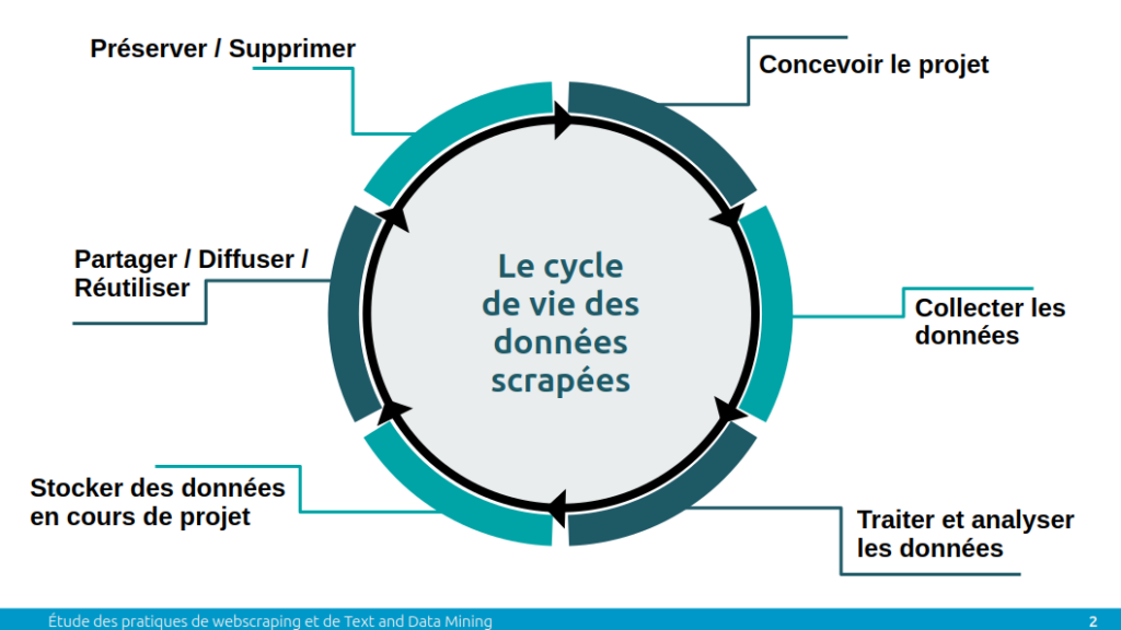 De plus, pour faciliter la lecture de l’ensemble de ces outils, l’étude est structurée en suivant les étapes du cycle de vie des données scrapées inspiré par le cycle de vie des données proposées par DoRANum.